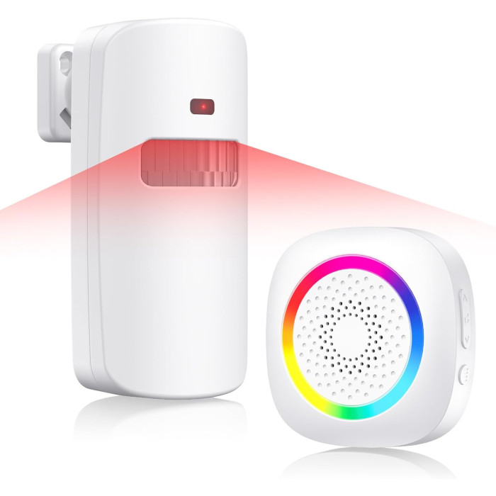 TECKNET Wireless Motion Sensor Door Chime TK-WD009 - бездротова система з датчиком руху та звуковим оповіщенням, призначена для сповіщення про рух людини або об'єкта. Комплект складається з датчика руху з батарейним живленням і приймача, який підключається до розетки і відтворює обраний звук при спрацьовуванні сенсора. Система підтримує великий радіус бездротового зв'язку та широкий вибір мелодій, що робить її зручною як для домашнього використання, так і для комерційних чи службових завдань.
