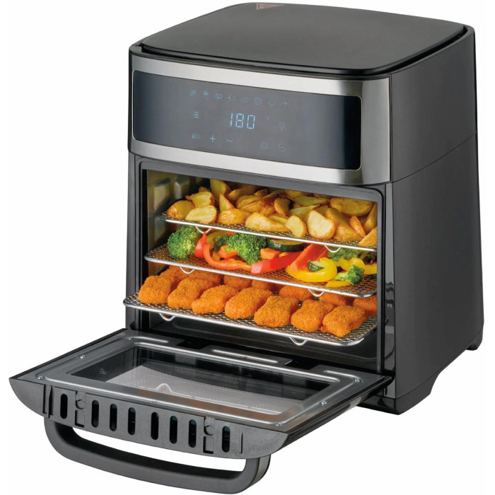Прилад із загальною ємністю 13 літрів та цифровим керуванням дуже швидко працює зі свіжими та замороженими продуктами, без додавання зайвого жиру. Їжа вражає. В комплект входять практичні аксесуари: грати для грилю, деко для запікання, грати для грилю та 4 сітчасті грати – вони забезпечують велику площу поверхні для сушіння. Практична додаткова функція: дверцята можна зняти для полегшення чищення.