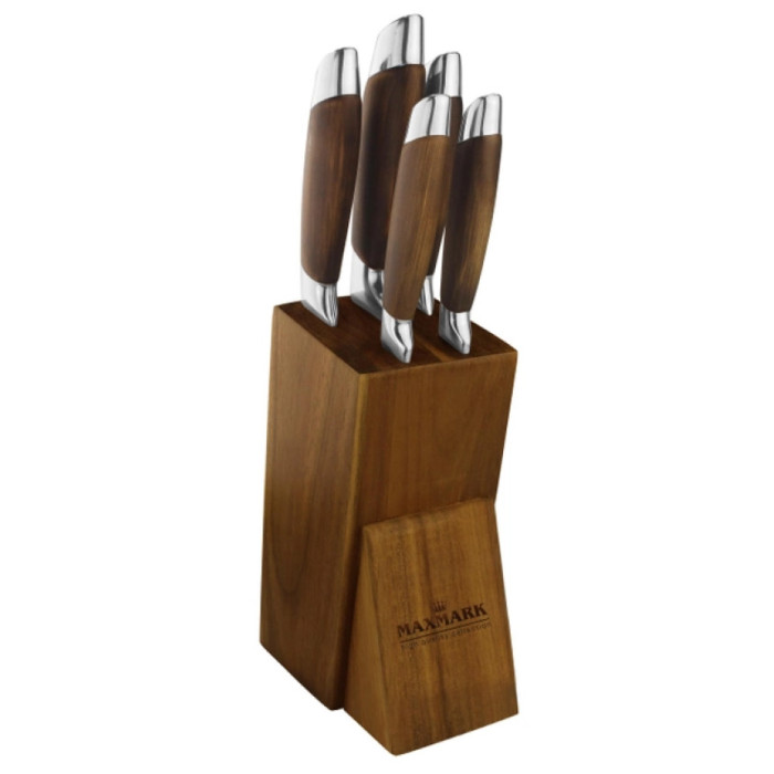 Набір ножів Maxmark MK-K09 - це практичне та функціональне рішення для повсякденного використання на кухні. Комплект включає найзатребуваніші типи ножів, які дозволяють виконувати широкий спектр кулінарних завдань: від нарізки овочів та фруктів до оброблення м'яса та хліба. Всі ножі зручно розміщуються у компактній дерев'яній підставці, забезпечуючи порядок та безпеку зберігання.