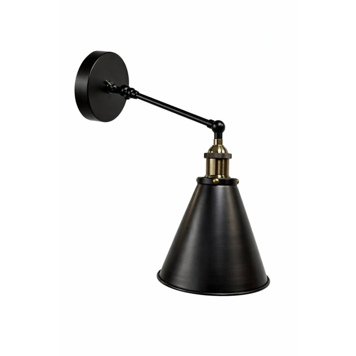 Стильний настінний світильник у лофт-дизайні стане акцентним елементом інтер’єру та забезпечить комфортне зональне освітлення. Металевий плафон конічної форми та поворотний кронштейн дозволяють змінювати напрямок світла залежно від потреб. Поєднання матового чорного кольору з латунними елементами додає світильнику сучасного та водночас індустріального характеру.