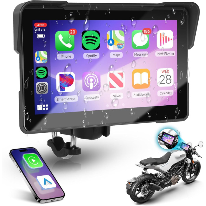 Портативний мотоциклетний сенсорний екран із підтримкою бездротових Apple CarPlay та Android Auto, розроблений для встановлення на кермо мотоцикла. Пристрій забезпечує доступ до навігації, музики, дзвінків та інших функцій смартфона під час їзди, при цьому стійкий до води та впливу зовнішнього середовища. Основна мета – підвищити комфорт та безпеку при використанні смартфона в дорозі за рахунок інтеграції всіх важливих функцій керування на окремий екран.