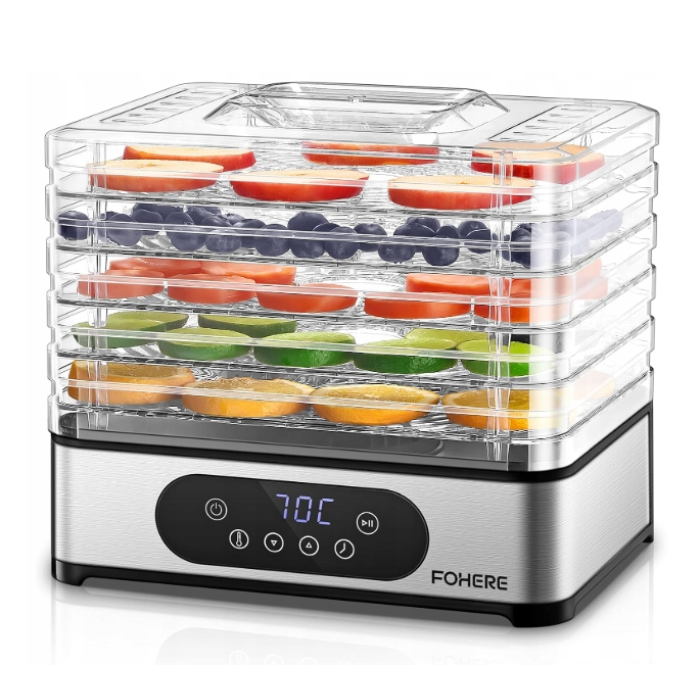Сушарка FOHERE з нержавіючої сталі з LED-дисплеєм потужністю 420 Вт призначена для рівномірного сушіння продуктів завдяки циркуляції повітря та високої потужності. Вона дозволяє самостійно готувати смачні сухі продукти для сім'ї – наприклад, бананові чи яблучні чіпси, сушені трави, овочі та фрукти. Крім того, сушарка також підходить для приготування ласощів та жувальних кісточок для домашніх тварин.